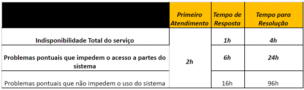 6.1. A capacitação técnica prestada pela DESKBEE ao ASSINANTE, prevista na PROPOSTA COMERCIAL, habilita o usuário certificado a prestar apoio de primeiro nível aos usuários cadastrados pelo ASSINANTE. Assim, dúvidas sobre procedimentos e funcionalidades deverão ser esclarecidas por este usuário certificado do ASSINANTE. No caso de problemas ou defeitos identificados durante o uso do software, o usuário do ASSINANTE contará com suporte técnico via acesso online, pelo painel ou abrindo um chamado pelos canais disponibilizados, conforme o seguinte SLA de atendimento: